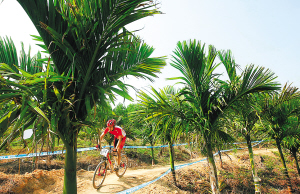 | 图为在2010年全国山地自行车冠军赛中,一名车手经过一片槟榔林。(资料照片)