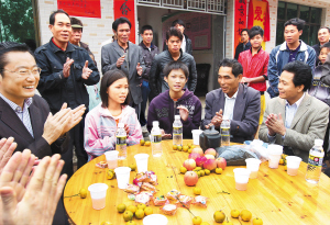 | 今年初,儋州市排浦镇玉田村孤儿张金耿、张金妹兄妹(右三、左二)住进了社会各界给他们捐建的新房。儋州市领导及爱心人士按照农村的习俗,庆祝兄妹搬入新房。 本报记者 苏晓杰 摄 |