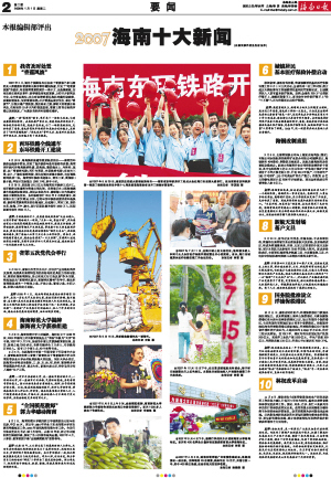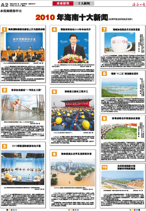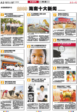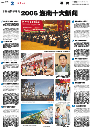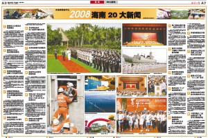 新闻记录历史 2006年—2010年海南年度新闻回放 ○ GDP超千亿,财政收入过百亿 ○ 卫留成主政海南 ○ 中小学危改工作全面完成 ○ 农村合作医疗和低保全面推进 ○ 800万吨炼油项目投产 ○ 省委四届九次全会召开 ○ 海南东环铁路获准立项 ○ 两岸农业合作论坛开幕 ○ 海南阻击高考移民 ○ 三亚征集城市名片 ○ 海南岛自由贸易区构想提出 ○ 海南先行先试建设国际旅游岛 ○ 琼州海�