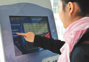 | 信息化走进了海南一号工程———东环高铁。图为市民在电子信息屏幕上查询高铁动车组运行时刻表。 本报记者 古月 摄 |