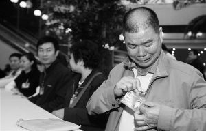 2月20日,来自三亚的何来再代表在佩戴刚领到的代表证。 当天,出席省四届人大四次会议的代表陆续抵达驻地寰岛泰得大酒店。省四届人大四次会议将于2月21日在省人大会堂开幕。 本报记者 宋国强 摄