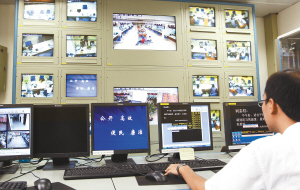 | 省政务中心监控室内,工作人员正在通过视频观看各办事窗口情况。