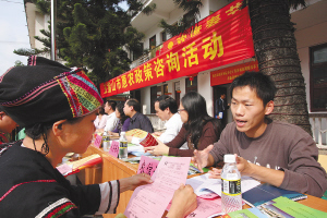 | 五指山市农信社工作人员向村民解答小额贷款政策。
