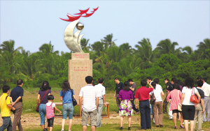 | 海南航天发射场一号工位纪念碑。建设中的海南航天发射场已经吸引了一些游客前来参观。 本报记者 李幸璜 摄 |