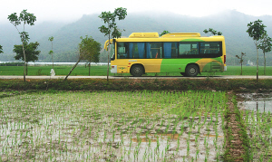 | 三亚市吉阳镇,直通市区的9路公交大巴开到上廖村口。畅通工程让农民进城更方便。 本报记者 李英挺 摄