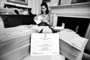 威廉王子4月大婚 英国王室发喜帖 2月16日,一名工作人员在英国白金汉宫整理邀请函。 英国王室官员19日说,英国女王伊丽莎白二世已向国内外大约1900人发出邀请函,请他们出席威廉王子与未婚妻凯特·米德尔顿定于今年4月举行的婚礼。据报道,受邀者既包括王室成员、国家元首、足球明星等“重量级”人物,也包括普通民众,如“准新人”朋友、慈善人士甚至无家可归者。 新华社/法新