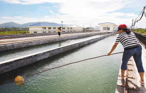| 2008年,陵水自来水厂内,两名工人在清理净水池。 本报记者 宋国强 摄 |