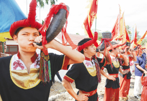 | 保亭新政镇新村小组黎族同胞告别茅草房,搬进了宽敞明亮的新瓦房,黎家小伙吹起牛角号庆贺。 特约记者 黄青文 摄 |