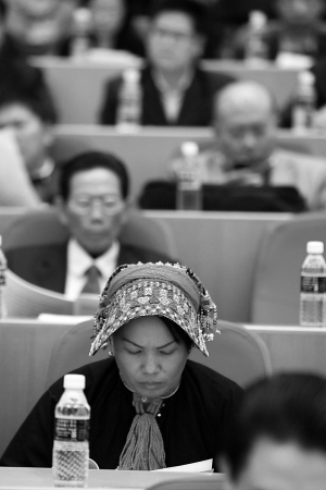 | 2月21日,省四届人大四次会议在省人大会堂隆重开幕。图为来自儋州市兰洋镇番打村委会南吉村的苗族代表邓洁玲在认真听取政府工作报告。