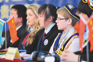 2月20日,一位爱尔兰青少年扮演的哈萨克斯坦代表(右一)在“模拟联合国会议”现场。 当日,作为“2011中欧青年交流年”的活动之一,来自爱尔兰的22名青少年继续在贵阳和中国学生一起开展“模拟联合国”活动。两国学生们分别扮演成10个联合国成员国的代表,共同探讨“是否支持安乐死”的提案。 新华社发