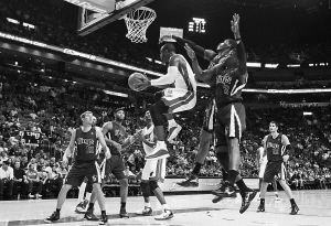 2月22日,在NBA常规赛中,热火队主场以117:97战胜国王队。图为热火队球员韦德(中)带球上篮。