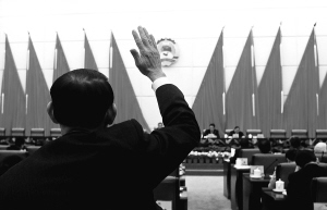 2月22日,海南省政协五届四次会议联组讨论会上,政协委员们争着按自己面前的话筒按钮踊跃发言。为了能争取到发言机会,一位政协委员只好站起来举手抢发言机会。 本报记者 李英挺 摄