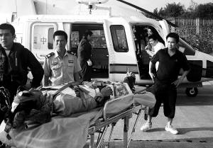 | B-7303救助直升机平稳降落在三亚凤凰国际机场后,受伤越南渔民被地面早已等候的120急救车接走。