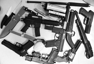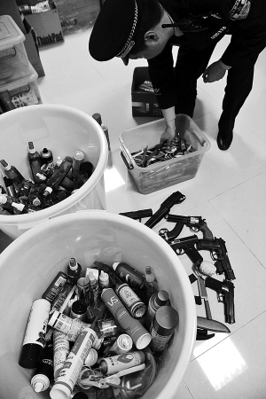 | 铁路安检工作人员堵截的部分违禁品。 本报记者 古月 摄 |