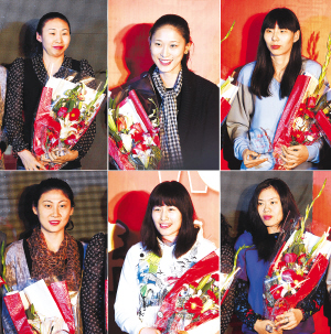 25日,“中国女子篮球甲级联赛(WCBA)十年颁奖庆典”活动在浙江安吉举行。图为获得十年最佳阵容的苗立杰、隋菲菲、陈楠(上排从左到右)和卞兰、宋晓云、陈晓丽(下排从左到右)在颁奖庆典上。 新华社发