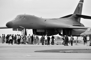 3月1日,人们在澳大利亚墨尔本阿法隆机场举行的国际航空展上观看一架美军B-1轰炸机。 澳大利亚国际航空展当日开幕。 新华社/法新