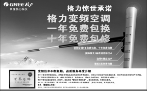 即日起,凡购买格力变频空调的消费者,自购买之日起1年内,因产品本身质量问题,均可享受“免费包换”服务;自购机之日起10年内,享受免费包修服务。据了解,新空调一年内发生故障的概率在60%以上,格力凭借强大的品牌实力、一流的品质和服务,在国内率先推行“一年免费包换、十年免费包修”政策,从根源上解决售后问题,是实实在在的为消费者解除后顾之忧。面对格力强大的服务承诺,其他品牌也纷纷推出各种服务概念进行炒作,但至今没有品牌敢跟进和效仿格力的“一年免费包换”承诺。