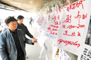 3月2日,人们在青岛长途汽车站劳务市场查看招工信息。 近日,山东省人力资源和社会保障部门对农村劳动力进城务工情况进行了调查显示,在各地出现用工紧张的情况下,山东农村劳动力对薪酬水平要求逐年提高,要求每月工资在1500元以上的人员占绝大部分,具有较高技术水平的求职人员,一般要求每月2500元至3000元工资,甚至更高。 新华社记者 李紫恒 摄