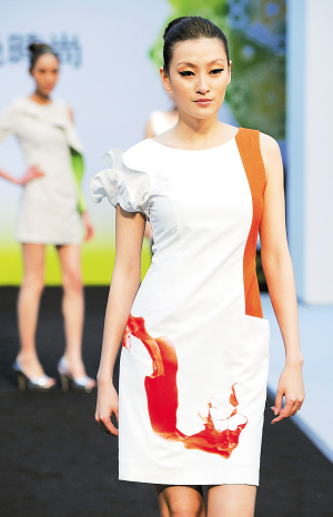 ← 3月2日,模特在台北展示由Ice Cool“冰咖啡纱”制成的时装。 当日,在2011春季FUSE纺织时尚月第二阶段“品牌心潮流”展演中,模特展示了由Ice Cool“冰咖啡纱”制作的时装。这种“冰咖啡纱”由咖啡渣结合回收的塑料瓶、具有凉感的矿石粉末等制成,用其制作的服装具有抗臭、防泼水、透气的功能。 新华社发(吴景腾 摄)