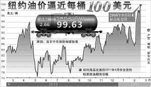由于北非中东局势持续动荡,国际油价3月1日大幅上涨,纽约油价逼近每桶100美元,和伦敦油价一起创下两年多以来的最高收盘价。国际油价近期又走到每桶100美元的敏感区。油价为诸多商品价格追溯的重要源头,它将如何影响当前国内外经济?