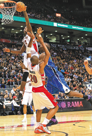 | 3月1日,在NBA常规赛中,猛龙队主场以96:90战胜黄蜂队。图为猛龙球员戴维斯(上)封盖。 新华社发 |