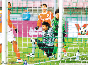 | 3月2日,山东鲁能队在亚冠小组赛中0:1不敌全北现代队。图为鲁能队失球瞬间。 小新发 |