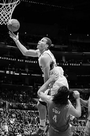 北京时间3月3日,火箭队在客场以103:106不敌快船队。图为快船队当红新星格里芬(上)扭曲身体上篮。 小新发