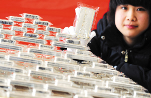 3月2日,南京老万宝银楼的工作人员展示顾客订制的每根重达1公斤的银条。 日前,南京一投资者在南京老万宝银楼一次性消费700多万元购买了1吨银条,每根银条重1公斤,一共1000根,创下南京单笔白银销售记录。近来,随着国际国内银价上涨,不少投资者选择白银进行投资。 新华社发
