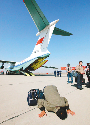 | 3月4日,在利比亚工作的中国水电二局工人王克荣乘机回国后激动地亲吻祖国大地。 |
