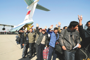 | 3月4日,在北京南苑机场,搭乘空军运输机回国人员激动地走下飞机。 (本栏照片:新华社发) |