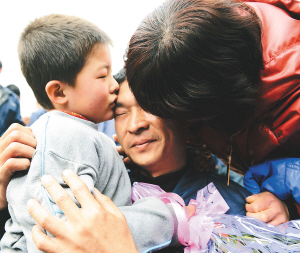 | 3月3日,建筑工人徐中福抵达日照市后与妻儿团聚。 |
