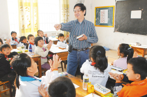 | 3月5日,海南书画院20多名书法、美术专家,深入白沙开展“爱美无界”艺术扶贫活动。图为海南书画院副院长柯兴发(中)给白沙第一小学部分学生上美术课。