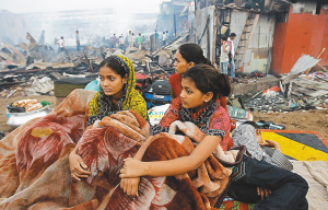 孟买火灾 贫民窟2000人无家可归 《贫民窟的百万富翁》的童星家成废墟 3月5日,在印度孟买市加里布纳格尔贫民窟,出演奥斯卡获奖电影《贫民窟的百万富翁》的童星鲁比娜·阿里(右)坐在自家烧毁的房屋废墟旁。 印度孟买加里布纳格尔贫民窟4日晚间发生火灾,持续大约3小时,致21人受伤,大约2000人无家可归,其中包括童星鲁比娜·阿里。大火吞噬了电影《贫民窟的百万富翁》带给她的所有奖品和她整理的相关照片与剪报集。 新华社/路透