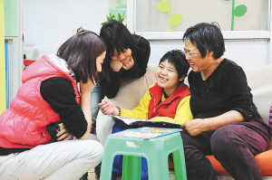 社工在指导18岁的智障女孩小欣(化名,右二)画画。广州从2008年开始委托共青团购买社会组织提供的青少年事务社工服务,针对青少年群体中出现的心理障碍、失学失业等问题提供专业的社工服务。 新华社发