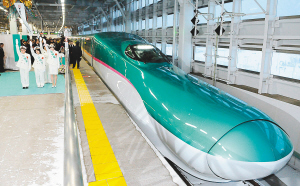 3月5日,一列新型子弹头列车在日本北部的青森火车站出发。这种细而长的新型列车将首先在东京与青森之间运行,时速达到300公里。其车厢内座位的舒适程度类似客机商务舱座位。 新华社/路透