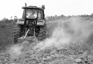 | 3月6日,儋州金色阳光农机专业合作社的一台大马力开荒拖拉机,在王五镇山营居委会黄竹头村小岭地进行荒地深翻作业。