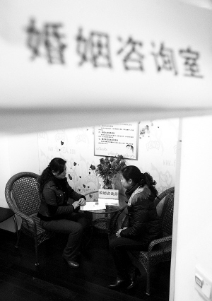 3月6日,湖北首家“婚姻医院”的婚姻分析师为上门咨询的市民解疑答惑。 当日,湖北省首家“婚姻医院”在武汉市挂牌营业。它的出现填补了湖北省“情感诊所”的空白。“婚姻医院”以“解决婚姻问题、改善夫妻感情、促进家庭文明、构建和谐社会”为宗旨,为顾客提供婚姻质量分析、外遇行为矫治、婚姻涉法维权等咨询服务。 新华社发