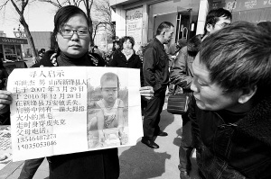 3月6日,来自山西新绛县的黄引果拿着自己孩子的资料,向过往市民求助。 当日,由山西6个失踪儿童家庭父母组成的“寻子团”来到太原寻找失踪的孩子,他们将100多名失踪孩子的照片和信息制作成条幅,希望热心人能提供线索。 这些父母自从孩子失踪后,奔波在全国多个省区市寻找线索。此后他们成为“宝贝回家志愿者协会”的志愿者,在找寻孩子的同时帮助更多人寻找失踪的孩子。 新华社发