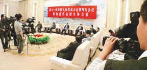 | 3月7日下午,海南代表团在人民大会堂海南厅举行开放团组活动。 本报特派记者 李英挺 摄 |