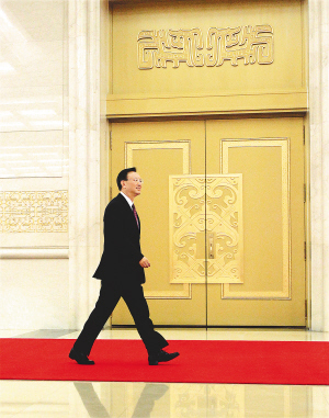 小李拍两会 3月7日,十一届全国人大四次会议在人民大会堂金色大厅举行记者会,由外交部长杨洁篪就我国的对外政策和对外关系回答记者提问。杨洁篪身着深色西服,戴紫红色领带,架一副细框眼镜,面带微笑,媒体记者对这位外长最多评价是儒雅谦和。图为杨洁篪步入金色大厅出席记者会。 本栏图片由本报特派记者 李英挺 摄