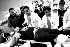 3月7日,在巴勒斯坦纳布卢斯,医生为一名在冲突中受伤的巴勒斯坦人治疗。 据目击者和医护人员称,犹太移民和巴勒斯坦人6日在约旦河西岸城市纳布卢斯发生冲突,致10人受伤。 新华社/法新