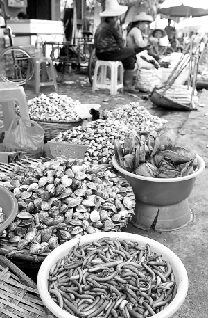 | 盛产沙虫的儋州市光村镇,市场内只有两盆沙虫出售。 本报记者 苏晓杰 摄 |