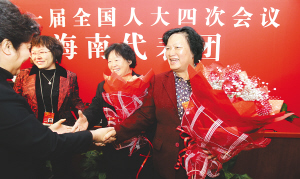 | 3月8日,海南驻京办工作人员向海南代表团的女代表献上鲜花,并送上温馨的节日祝福。 本报特派记者 李英挺 摄 |