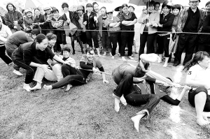 ↑3月8日上午,琼海市嘉积镇市政服务中心700多名环卫、园林、路灯管理女工组成11个参赛队,在细雨蒙蒙的万泉河广场举行庆“三八”拔河比赛给妇女节增添了热烈的气氛。 特约记者 蒙钟德 摄