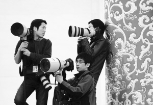 3月7日, 扛着“长枪短炮”的三位摄影记者在等待记者会开始。 本栏照片由本报特派记者 李英挺 摄