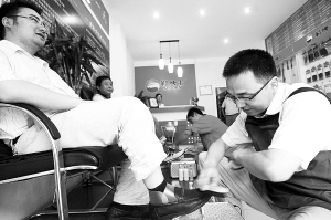 | 多位代表委员再次对就业“两难”问题展开争论:大学生与农民工没有可比性?这一现象折射出哪些深层根源?图为夏鑫(右)身着工作服给顾客擦皮鞋(2009年8月6日摄)。2009年5月,硕士毕业生夏鑫与王凯、李存豪等大学毕业生经过反复的市场调查和成本预算后,一起在浙江省长兴县合伙开办了一家擦鞋店。 新华社发 |