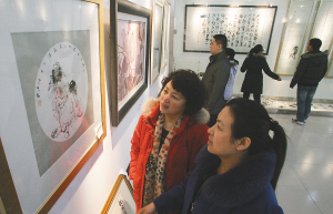 3月9日,村民在济南市历城区相公庄村美术馆观赏书画作品。 近日,山东济南市历城区相公庄村建起了展览面积达3000多平方米的美术馆,展出400余幅书画作品。村民们不仅可以在此欣赏到知名书画家的佳作,还能将自己的书画作品进行展览。 新华社发(吕传泉 摄)