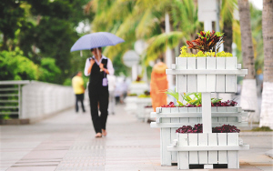 | 3月9日,三亚市街头新增的可移动木质组合式花盆。 本报记者 苏建强 摄 |