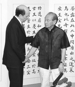 就美官员侮辱言论 美驻日大使 向冲绳县知事道歉 3月10日,在日本冲绳县那霸,美国驻日本大使鲁斯(左)向冲绳县知事仲井真弘多道歉。 美国驻日本大使鲁斯当日下午在冲绳县那霸与冲绳县知事仲井真弘多举行会谈,就美国国务院日本处处长马厄发表侮辱冲绳人的言论表示道歉。 新华社/法新