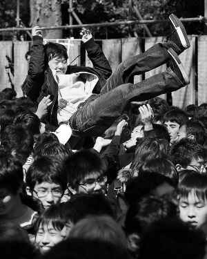 3月10日,在日本首都东京的东京大学校园,一名榜上有名的考生被高高抛起。 当日,日本东京大学在校园内张榜公布考上东大的新生考号。众多考生在榜前搜寻自己的考号,考上者欢呼雀跃,激动万分,场面热闹非凡。 新华社/法新